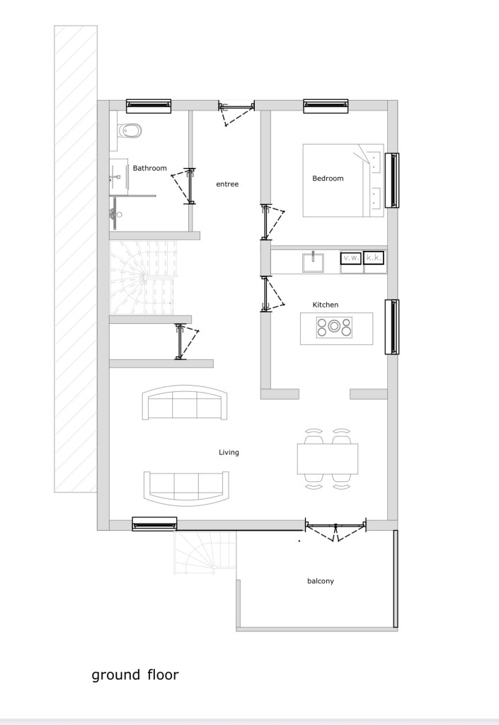 The ground floor has a wonderful kitchen and dining area and a cozy living room, a bedroom with a doublebed and a bathroom with toilet and shower.